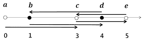 위의 조건으로 화살표를 그리면, 아래 <그림 3>과 같이 점 a의 화살표는 c로 연결된다. 점 b와 d의 화살표는 각각 d와 b로 연결된다. 또한 점 c와 e의 화살표는 각각 e와 c로 연결된다. 따라서 모든 화살표들의 길이 합은 3 + 3 + 2 + 3 + 2 = 13이다.