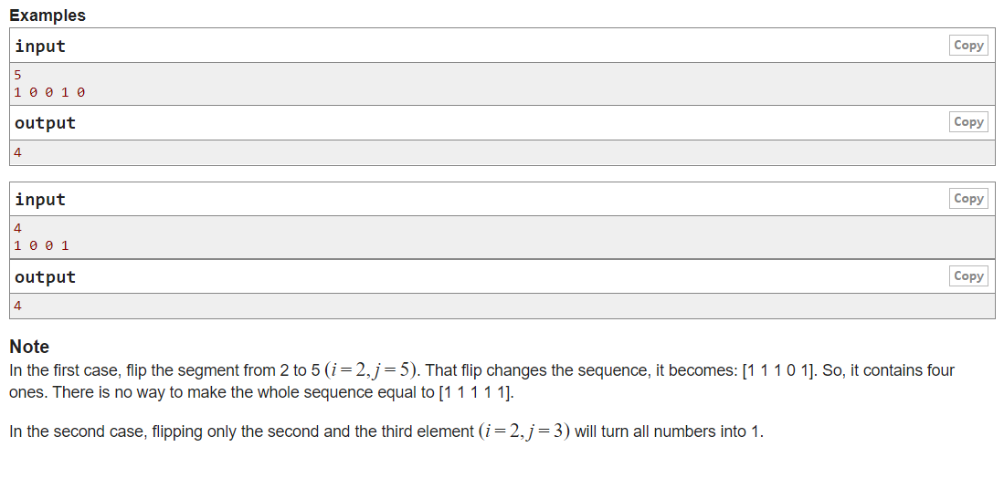 He writes n integers a 1, a 2, ..., a n. Each of those integers can be either 0 or 1. He's allowed to do exactly one move: he chooses two indices i and j (1 ≤ i ≤ j ≤ n) and flips all values a k for which their positions are in range [i, j] (that is i ≤ k ≤ j). Flip the value of x means to apply operation x = 1 - x.