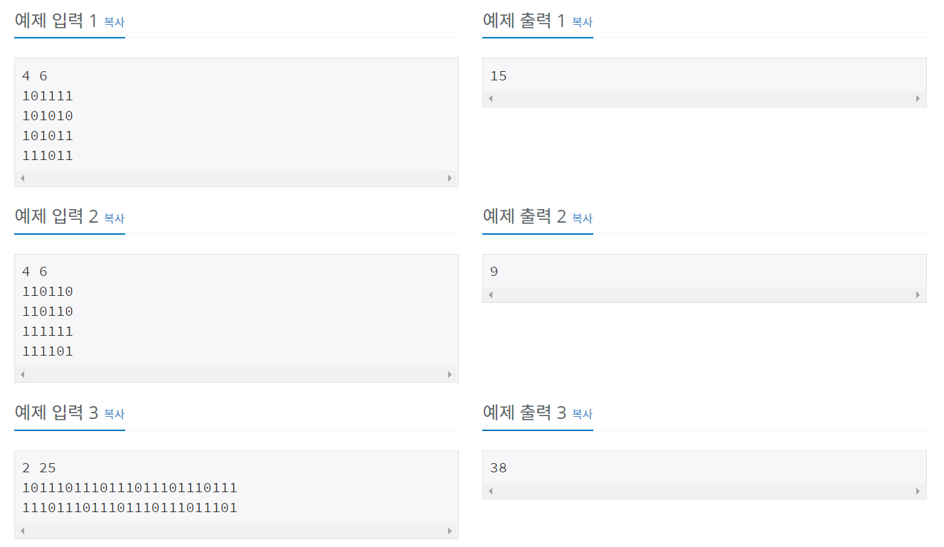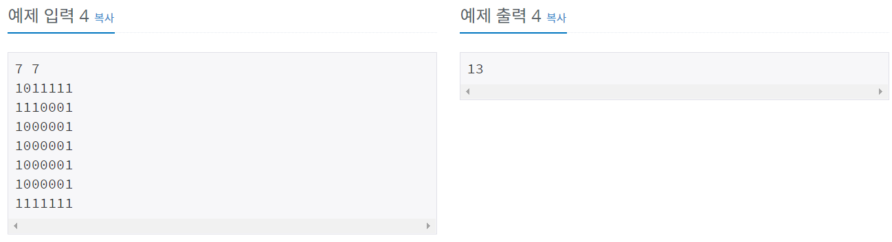 첫째 줄에 두 정수 N, M(2 ≤ N, M ≤ 100)이 주어진다. 다음 N개의 줄에는 M개의 정수로 미로가 주어진다. 각각의 수들은 붙어서 입력으로 주어진다.