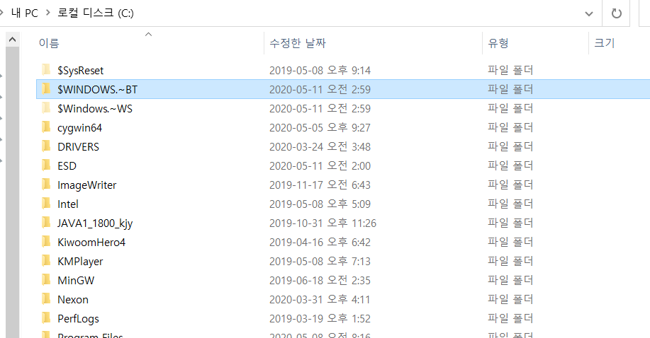 2. "%SYSTEMDRIVE%\$WINDOWS.~BT" 폴더 삭제하기