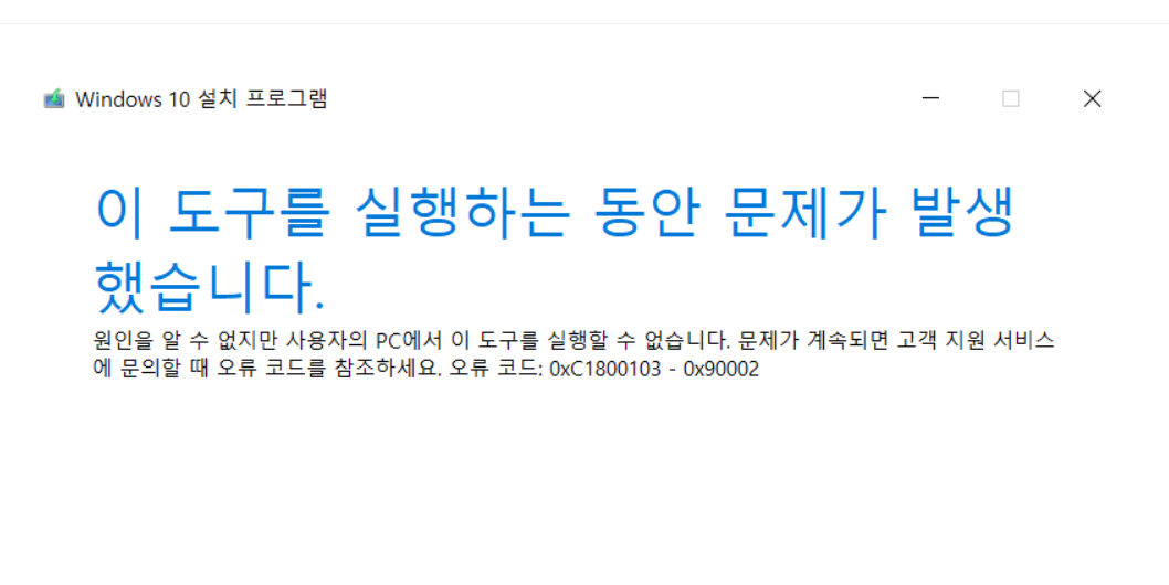 "원인을 알 수 없지만 사용자의 PC에서 이 도구를 실행할 수 없습니다. 문제가 계속되면 고객 지원 서비스에 문의할 때 오류 코드를 참조하세요. 오류코드: 0xC1800103 - 0x90002"