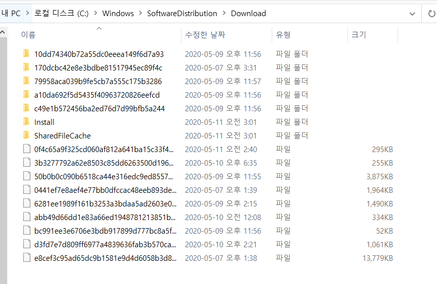 1. C:\Windows\SoftwareDistribution\Download 폴더 내부의 모든 파일을 삭제한 후, 윈도우 재시작