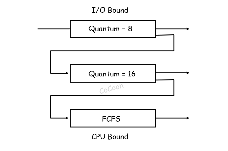 - 프로세스 생성 시 가장 높은 우선 순위 준비 큐에 등록되며 등록된 프로세스는 FCFS 순서로 CPU를 할당받아 실행된다. 해당 큐의 CPU 시간 할당량(Time Quantum)이 끝나면 한 단계 아래의 준비 큐에 들어간다.