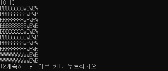 첫째 줄에 N과 M이 주어진다. N과 M은 8보다 크거나 같고, 50보다 작거나 같은 자연수이다. 둘째 줄부터 N개의 줄에는 보드의 각 행의 상태가 주어진다. B는 검은색이며, W는 흰색이다.