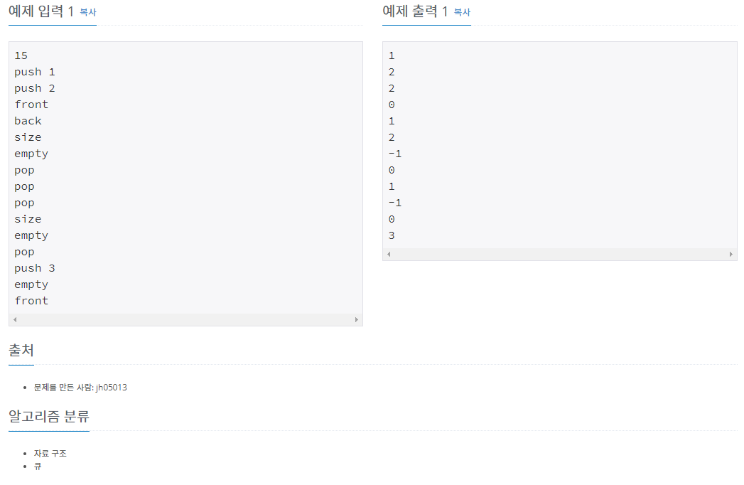 정수를 저장하는 큐를 구현한 다음, 입력으로 주어지는 명령을 처리하는 프로그램을 작성하시오.
