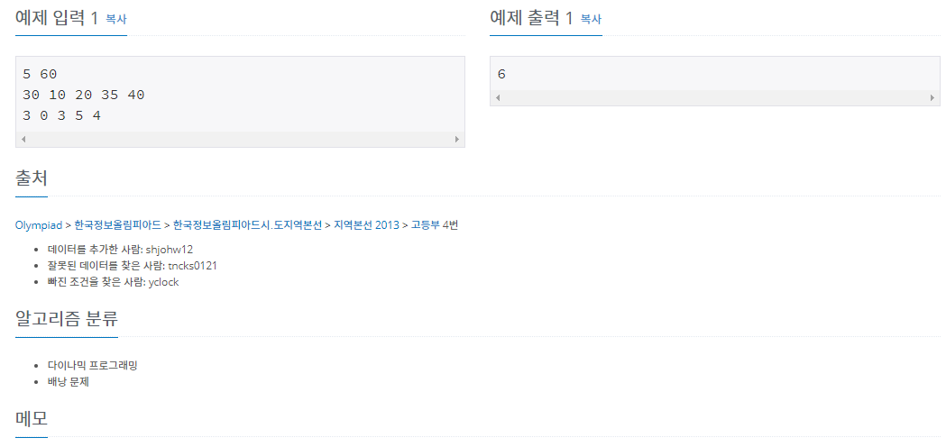 그리하여 dp[N]의 원소들 중에서 처음으로 M이상인 j(비용) 값이 이 문제의 정답이 됩니다.