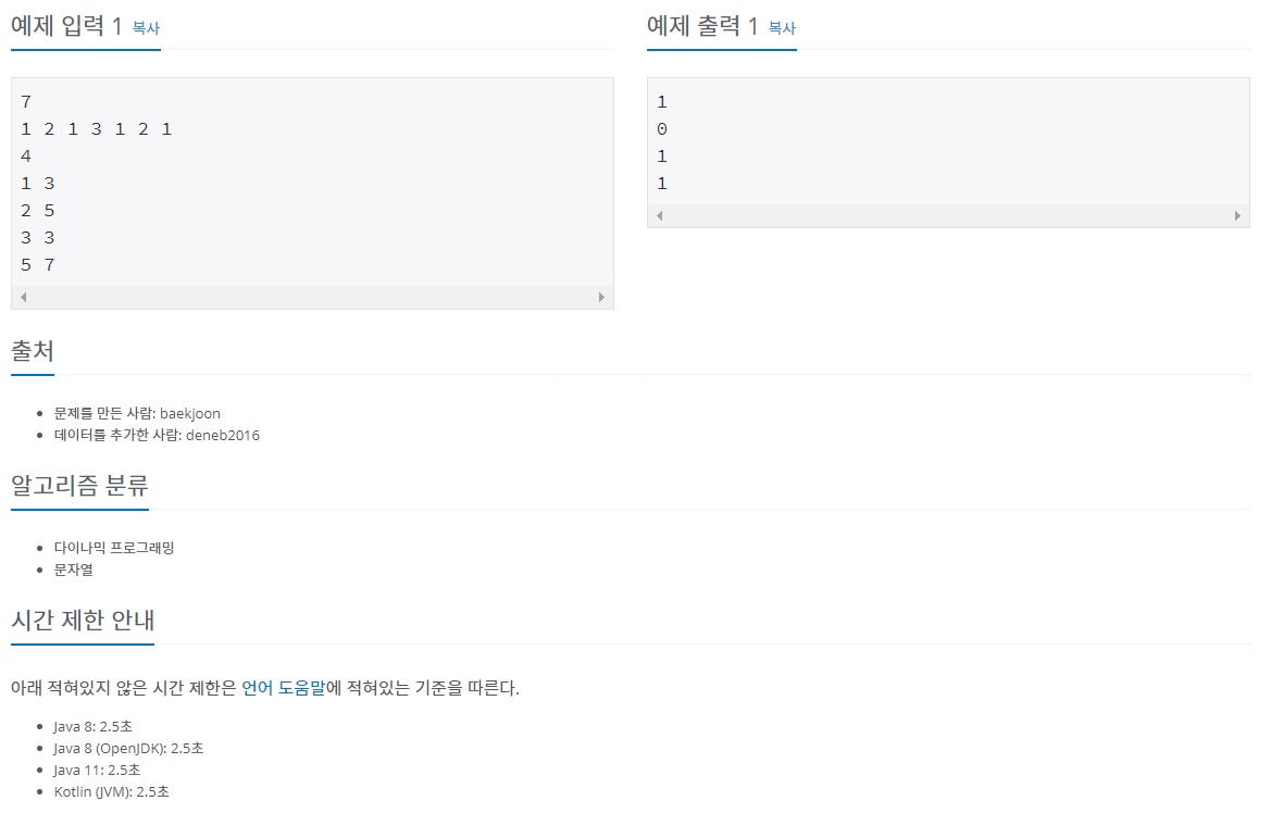 팰린드롬 수를 판별하는 법은 간단하게 가운데로 이동하면서 양쪽 값을 비교해서 대칭이 된다면 팰린드롬 수 인 것을 알 수 있습니다. 그러나 문제에서 질문의 개수가 최대 1,000,000개 이므로 이러한 방법은 시간초과가 발생할 것입니다. 그렇기 때문에 dp배열로 메모제이션하면서 답을 구해야 합니다.