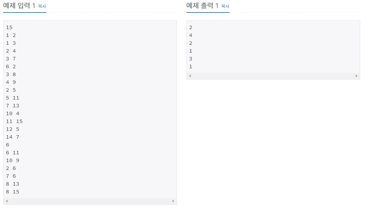 첫째 줄에 노드의 개수 N이 주어지고, 다음 N-1개 줄에는 트리 상에서 연결된 두 정점이 주어진다. 그 다음 줄에는 가장 가까운 공통 조상을 알고싶은 쌍의 개수 M이 주어지고, 다음 M개 줄에는 정