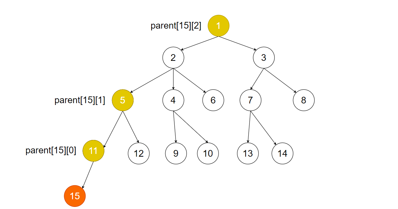 만약 깊이 8에서 1로 올라가는 상황을 생각해보면 한 칸씩 거슬러 올라갈 경우 7번의 연산을 해야 하지만 2의 x승씩 올라가게 된다면 4+2+1로 3번의 연산만으로 올라갈 수 있습니다.