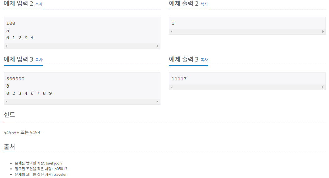 첫째 줄에 수빈이가 이동하려고 하는 채널 N (0 ≤ N ≤ 500,000)이 주어진다. 둘째 줄에는 고장난 버튼의 개수 M (0 ≤ M ≤ 10)이 주어진다. 고장난 버튼이 있는 경우에는 셋째 줄에는 고장난 버튼
