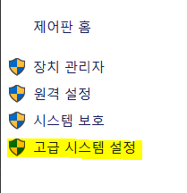 1. 내 컴퓨터-속성-고급 시스템 설정 혹은 검색으로 고급 시스템 설정 클릭 후 속성에 들어갑니다.