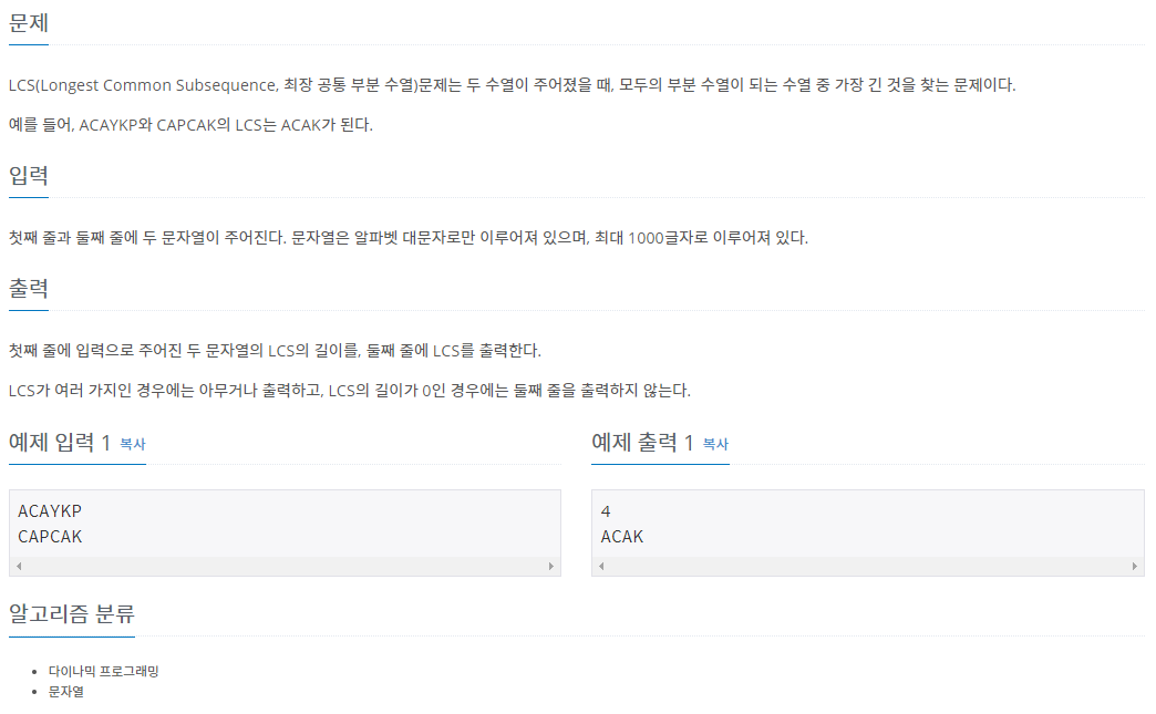 LCS(Longest Common Subsequence, 최장 공통 부분 수열)문제는 두 수열이 주어졌을 때, 모두의 부분 수열이 되는 수열 중 가장 긴 것을 찾는 문제이다. 예를 들어, ACAYKP와 CAPCAK의 LCS는 ACAK가 된다.