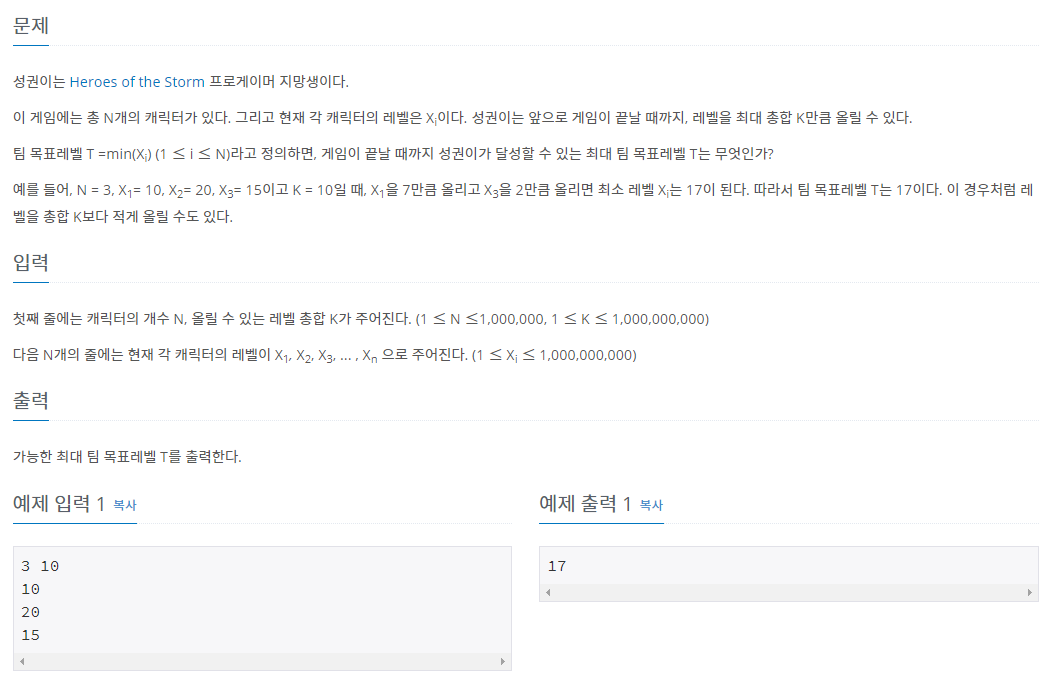 첫째 줄에는 캐릭터의 개수 N, 올릴 수 있는 레벨 총합 K가 주어진다. (1 ≤ N ≤1,000,000, 1 ≤ K ≤ 1,000,000,000) 다음 N개의 줄에는 현재 각 캐릭터의 레벨이 X1, X2, X3, ... , Xn 으로 주어진다. (1 ≤ X