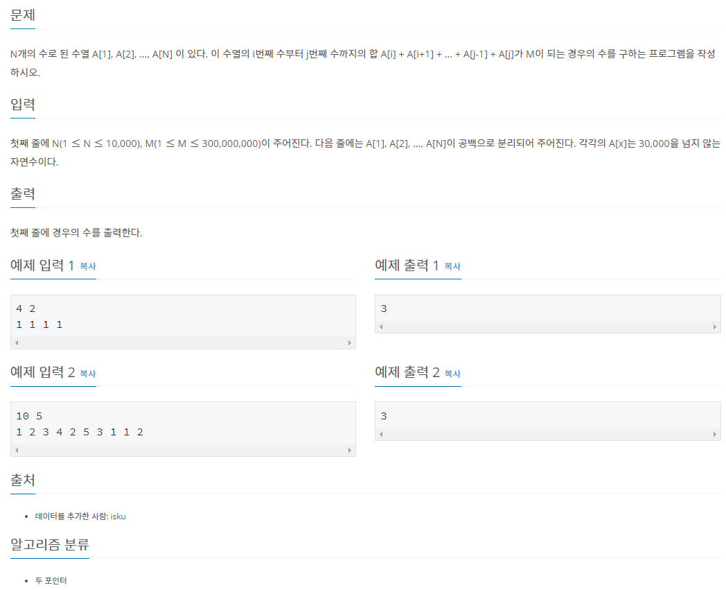 첫째 줄에 N(1 ≤ N ≤ 10,000), M(1 ≤ M ≤ 300,000,000)이 주어진다. 다음 줄에는 A[1], A[2], …, A[N]이 공백으로 분리되어 주어진다. 각각의 A[x]는 30,000을 넘지 않는 자연수이다.