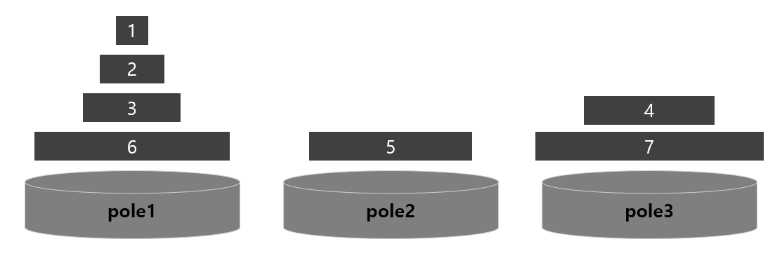 먼저 위의 예시에서 가장 큰 원판인 7이 pole3에 있기 때문에 모든 원판들은 pole3로 옮겨져야 합니다.