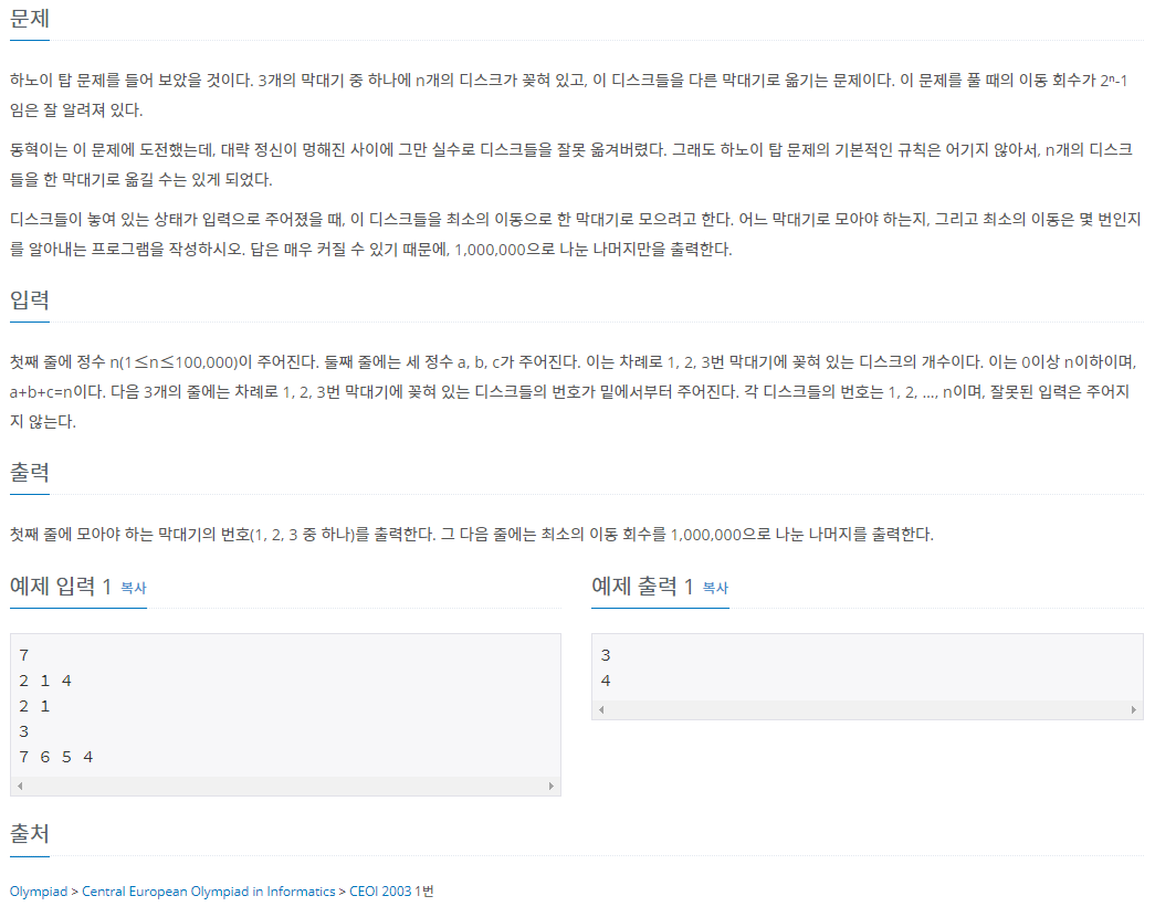 따라서 답은 3번 막대기에 최소 이동 횟수 42회로 옮길 수 있습니다.