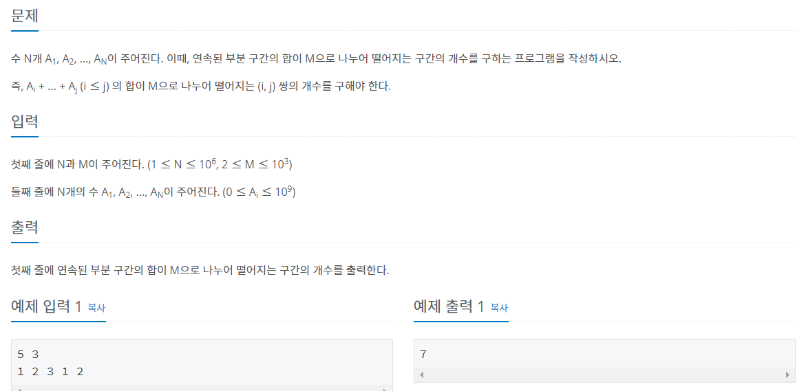 수 N개 A1, A2, ..., AN이 주어진다. 이때, 연속된 부분 구간의 합이 M으로 나누어 떨어지는 구간의 개수를 구하는 프로그램을 작성하시오. 즉, Ai + ... + Aj (i ≤ j) 의 합이 M으로 나누어 떨어지는 (i, j)