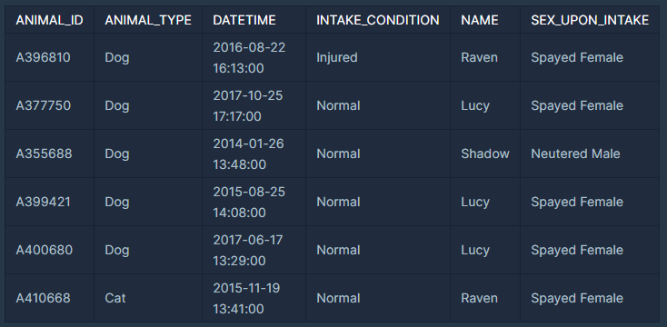 그러나 아래와 같이 작성하여 실행할 시 이름이 중복된 동물들의 동물 아이디와 이름이 출력되지만