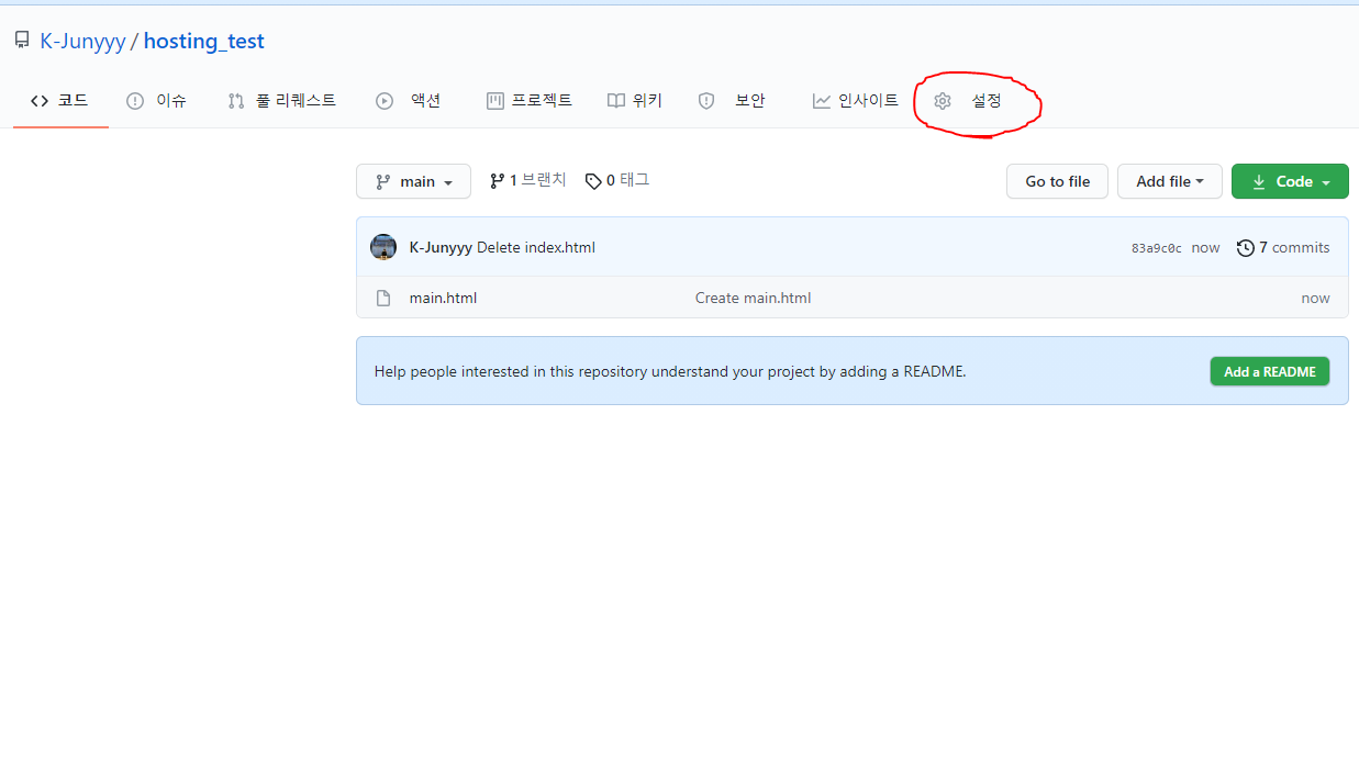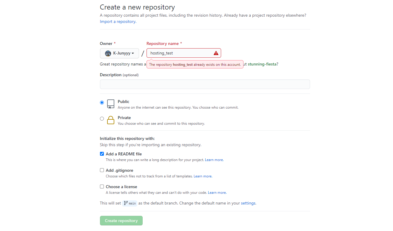 1. 깃허브에서 저장소를 생성합니다. (이미 생성된 저장소를 호스팅 할 시엔 3번으로 건너뛰세요.)