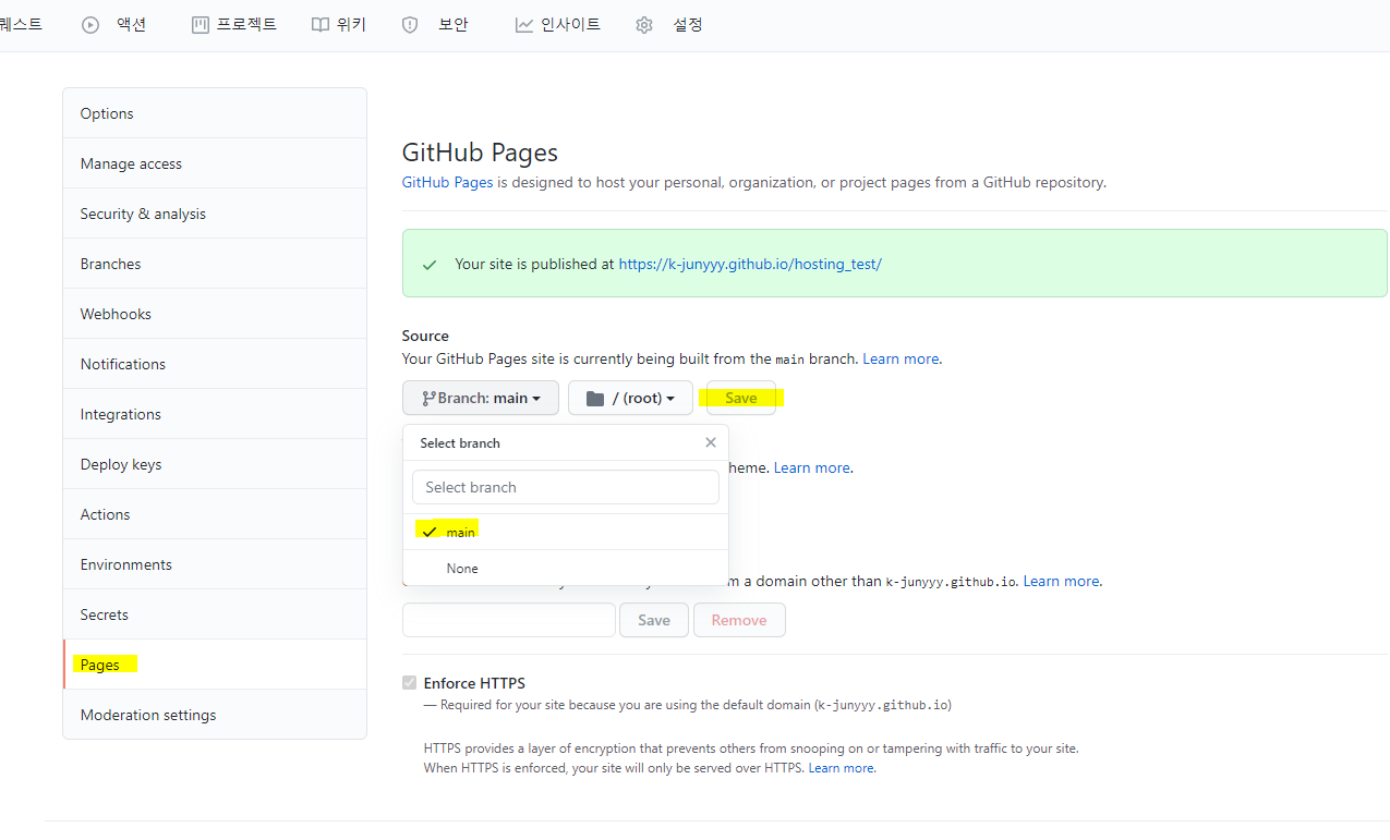 3. 저장소의 설정 탭에 들어간 뒤 Pages탭에서 Branch를 설정 후 Save 합니다.