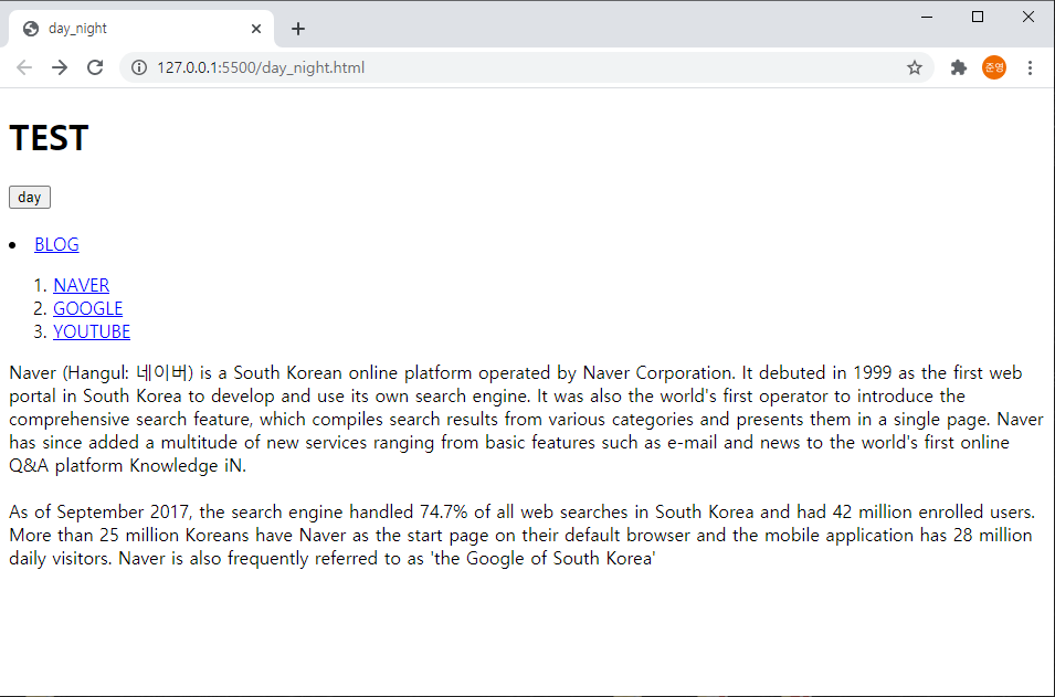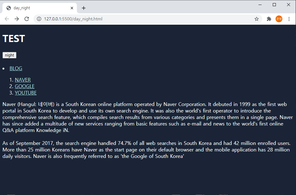 곧 시작할 프로젝트들에서 필요한 주간, 야간모드 기능을 미리 공부해봤습니다. 먼저 input 태그를 통해 버튼을 만들고 onclick의 속성 값으로 자바스크립트 function을 만들어서 버튼을 클릭할 때마다 버튼의 글자가 바뀌고 배경과 글자색이 이 바뀌는 것을 구현해봤습니다.