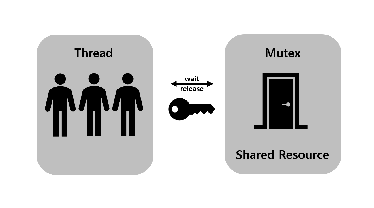 MUTual EXclusion으로 상호 배제라고도 합니다. 획득(Lock) 또는 해제(Unlock) 상태가 있으며 스핀락과 같이 접근 권한을 획득할 때까지 Busy Waiting 상태에 머무르지 않고 Sleep 상태로 들어가며 Wakeup 되면 권한을 획득을 시도합니다. 뮤텍스의 경우엔 Locking 메커니즘으로 오직 하나의 스레드만이 동일 시점에 뮤텍스를 얻어 임계 구역(Critical Section)에 접근할 수 있습니다. 그리고 획득(Lock) 또는 해제(Unlock)의 주체는 동일해야 합니다.