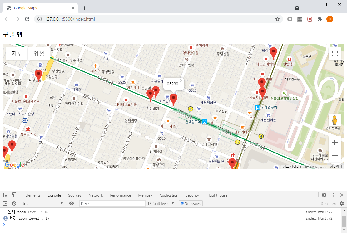 Google Maps API를 통해서 지도정보를 html로 띄우고 zoom level이 16 이상일 때만 정류소들의 위치를 마커로 표시하였습니다.