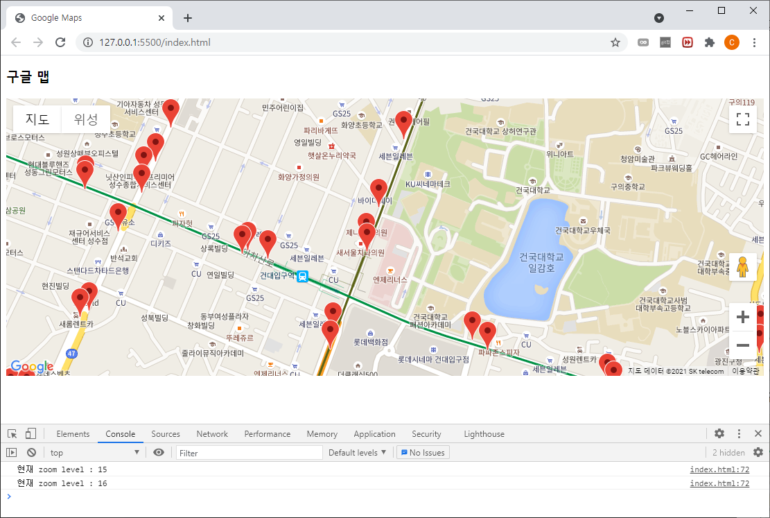 다시 zoom level이 16 미만이 되는 순간 모든 마커들이 사라지도록 하였습니다.