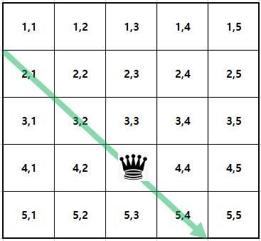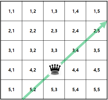 이해를 돕기 위해 (4,3) 지점에 퀸을 놓는다고 가정했을 때