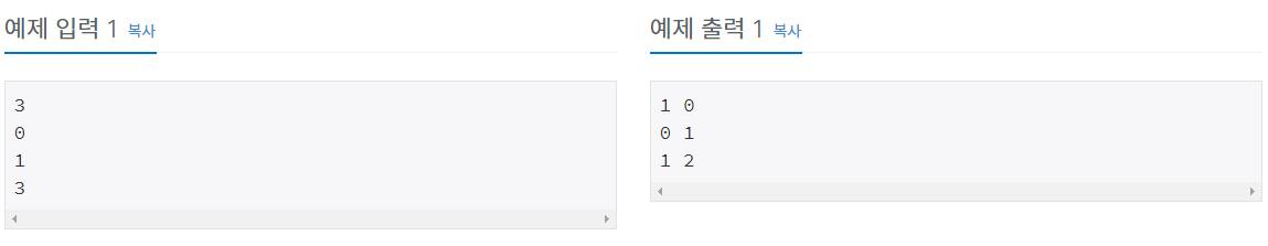 각 테스트 케이스마다 0이 출력되는 횟수와 1이 출력되는 횟수를 공백으로 구분해서 출력한다.