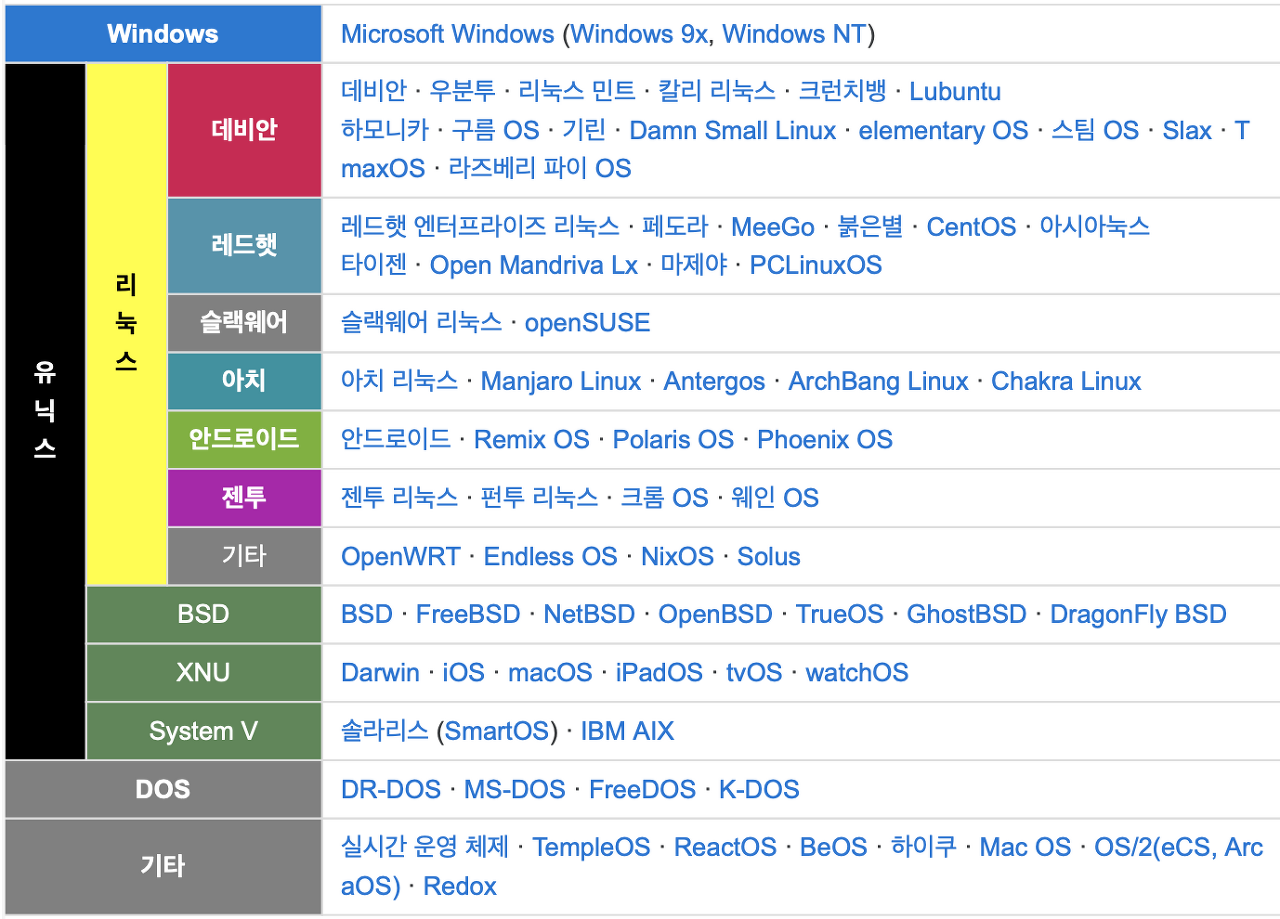운영체제의 경우 크게 임베디드, 서버, 모바일, 데스크톱의 4개의 시장으로 나뉘어 있습니다. 임베디드의 경우 리눅스 계열, 서버는 유닉스 계열, 모바일은 안드로이드, 데스크톱은 윈도즈가 점유율이 가장 높습니다.