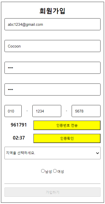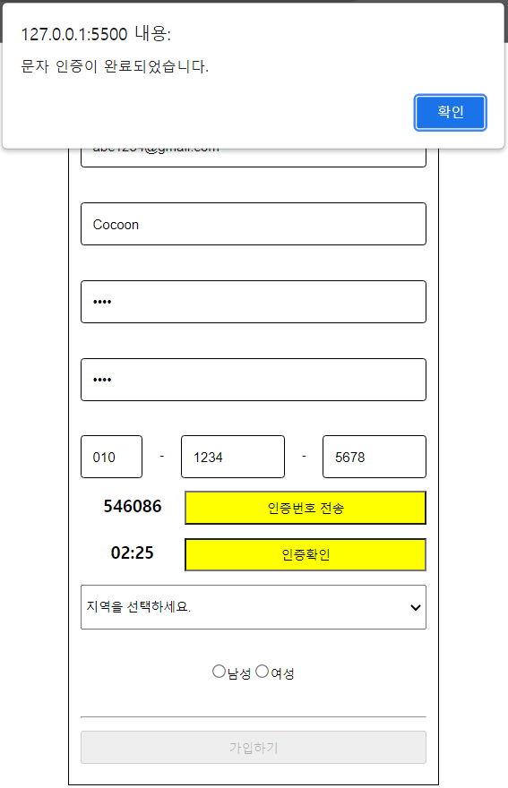 인증확인 버튼의 값이 "인증완료"로 바뀌게 됩니다.