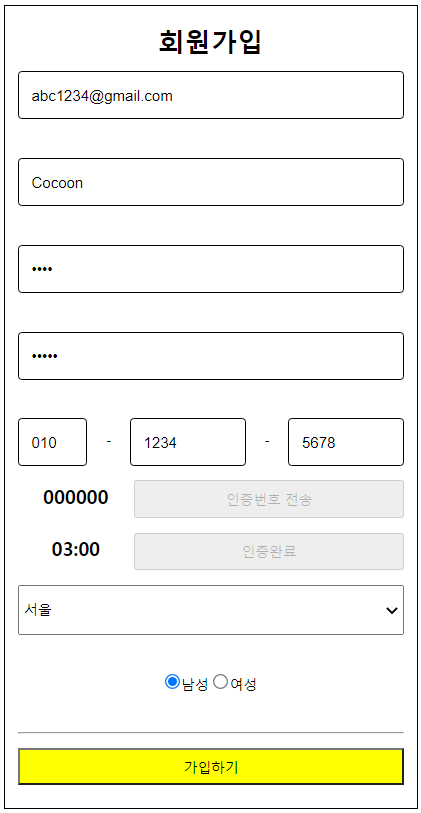 ✔️ 가입하기 버튼 클릭 시 이메일, 이름, 비밀번호, 비밀번호 확인, 지역, 성별 확인