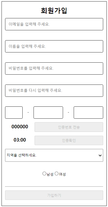 ✔️ 맨 처음 disabled 속성을 주어 인증번호 전송, 인증 확인, 가입하기 버튼 클릭 방지