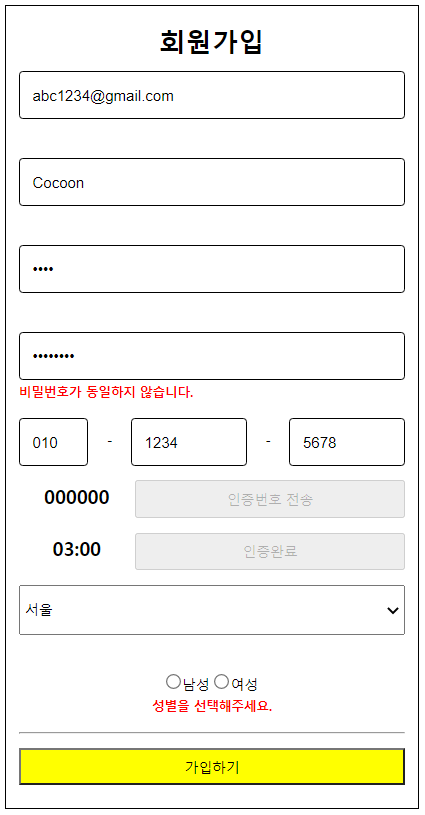 가입하기 클릭 시 위와같이 이메일 형식이 맞지 않는다거나 이름 누락, 비밀번호와 비밀번호확인이 일치하지 않음, 지역 미선택, 성별 미선택 등등 입력이 올바르지 않다면 빨간 글씨로 에러를 표시해줍니다.