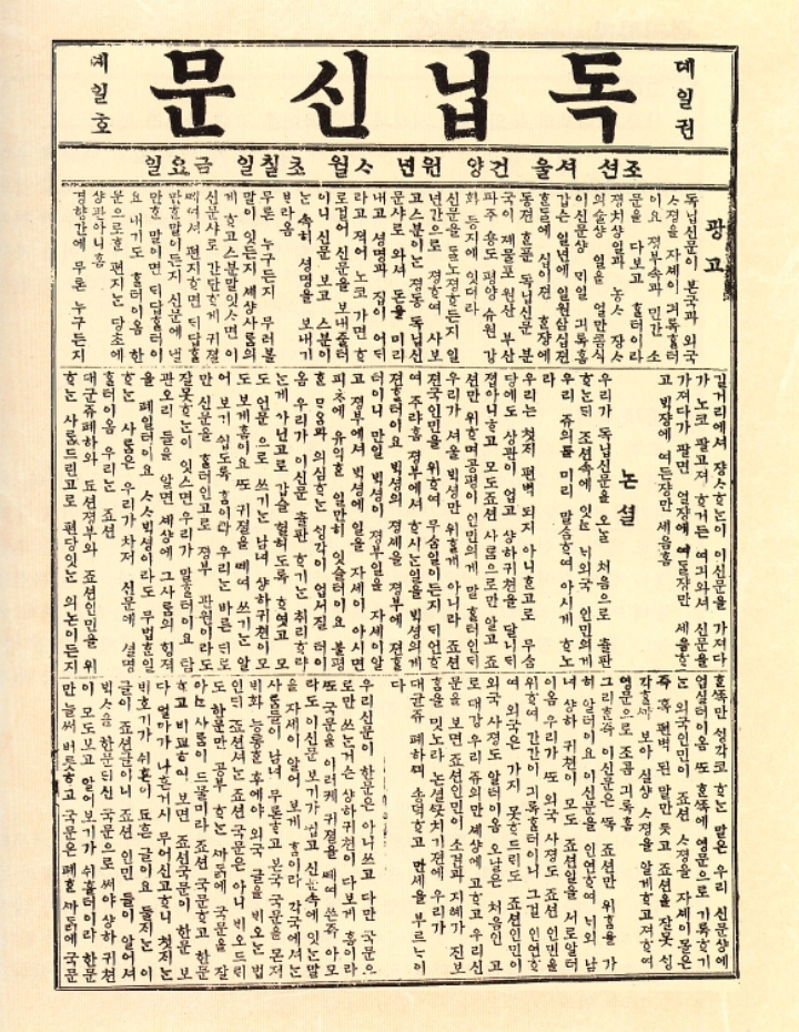 위 사진은 독립신문 창간호로써 '독립신문'이라는 제목이 우횡서로 적혀있습니다.