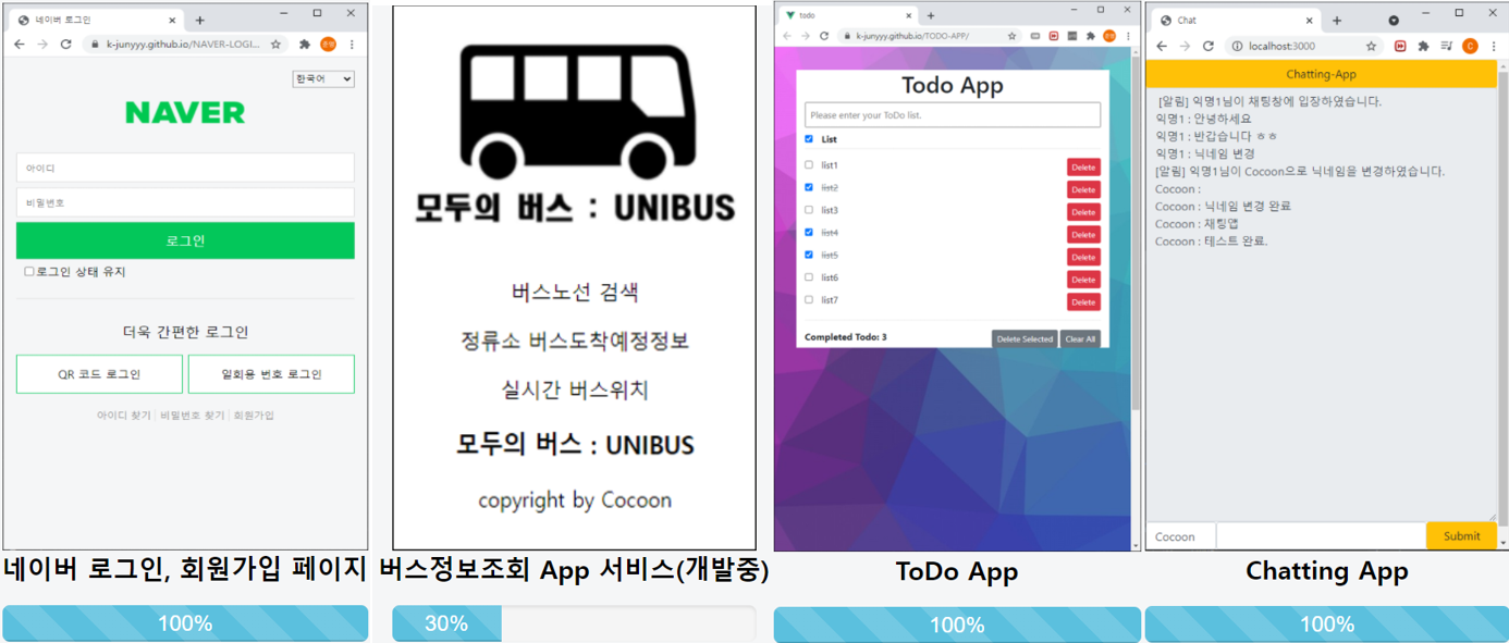 3개월간 알고리즘 문제풀이에 집중해서 백준 누적 500문제 이상 풀이, 플래티넘 등급을 달성하였고, 포트폴리오에 제출할 프로젝트가 필요해서 유튜브 강의를 보고 간단한 Chatting App, TODO List App을 만들었다. 그리고 버스정보조회 App도 만들려고 했으나 데이터베이스의 부재, 자바스크립트 사용 미숙으로 인해 아직까지도 미완성으로 남아있다.