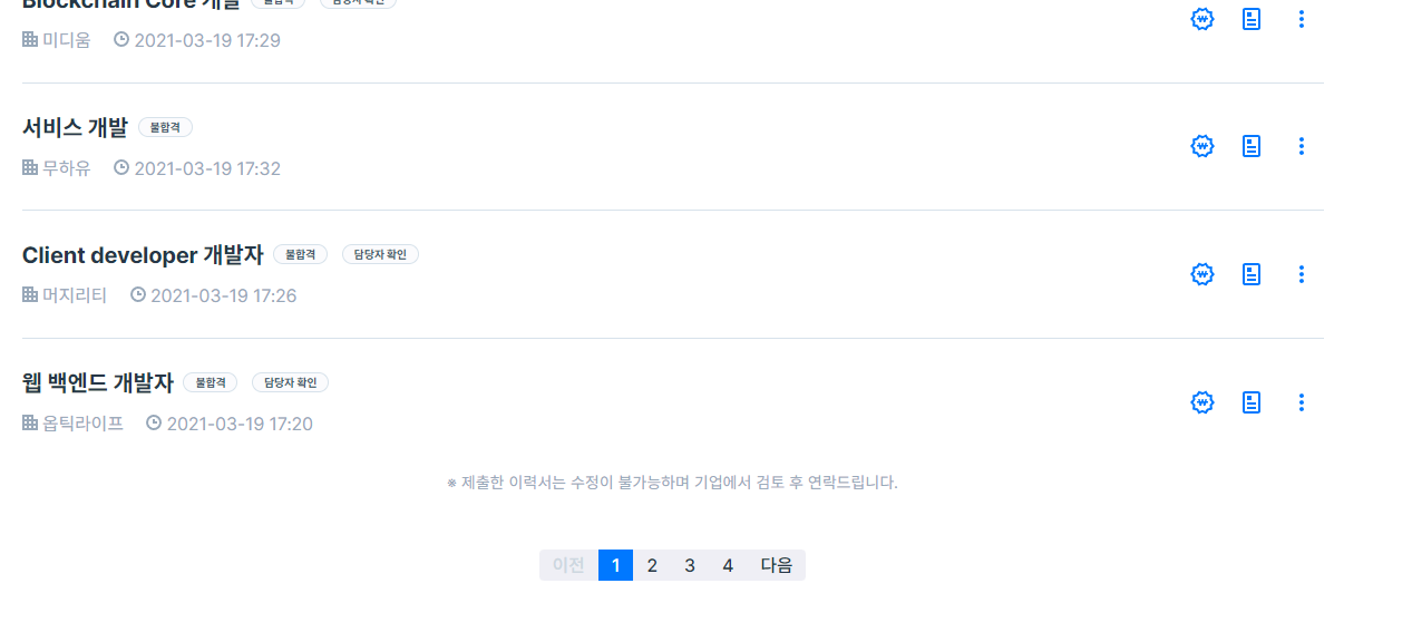 한 페이지당 20개 정도 있으니 대략적으로 70군데를 지원하였던 것 같다. 그중에서 다행히도 4군데 정도 연락이 와서 면접 기회를 얻게 되었고 물론 모두 좋은 결과가 있었던 것은 아니지만 면접에서 나온 질문들, 그리고 조언을 해주신 개발자분들 덕분에 내가 뭐가 부족하고 뭐가 필요한지 알게 되었다. 지금 생각하면 너무나도 낮은 스펙으로 아무 곳이나 지원을 했던 점, cs지식 부족으로 면접에서 질문에 제대로 답하지 못한 점이 문제였었다고 생각한다.