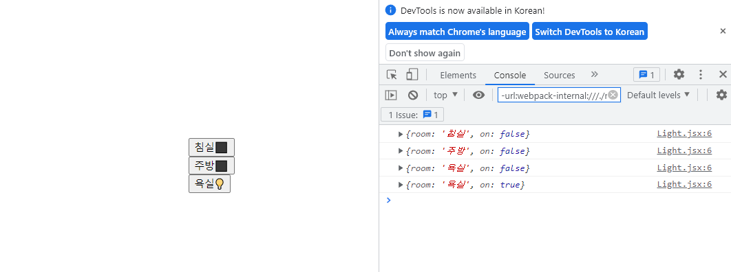 욕실에 대한 조명을 켜보면 욕실에 대한 Light 컴포넌트만 리 렌더링 된 것을 확인할 수 있습니다.