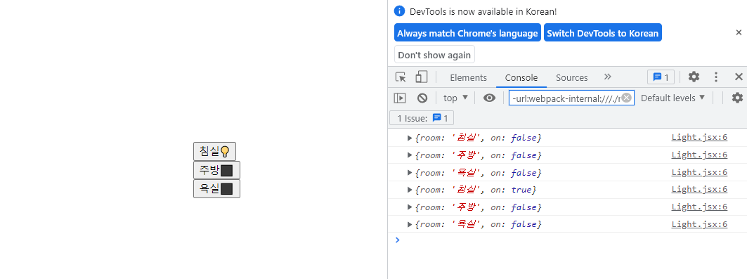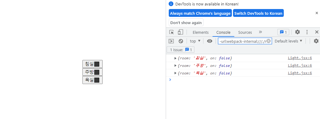 컴포넌트들을 생성하고 침실 토글 버튼을 클릭하고 콘솔 창을 확인해보니 침실뿐만 아니라 다른 모든 방에 대한 Light 컴포넌트 함수가 호출되는 것이 확인되었습니다.