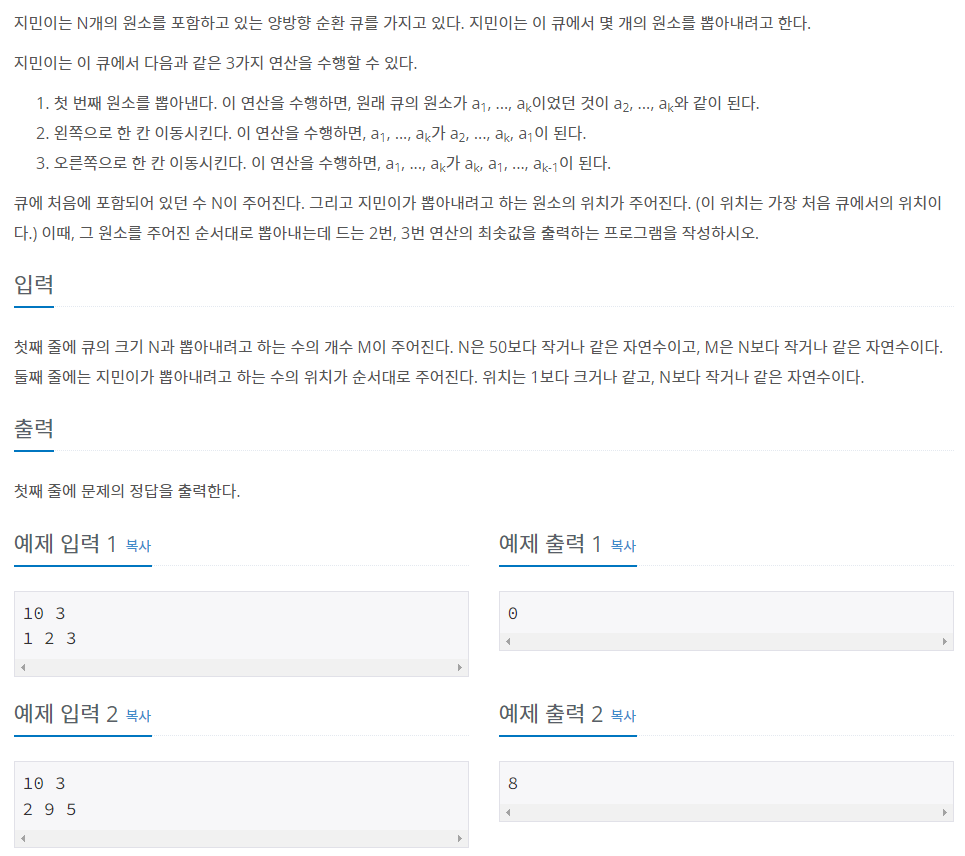 첫째 줄에 큐의 크기 N과 뽑아내려고 하는 수의 개수 M이 주어진다. N은 50보다 작거나 같은 자연수이고, M은 N보다 작거나 같은 자연수이다. 둘째 줄에는 지민이가 뽑아내려고 하는 수의 위치가