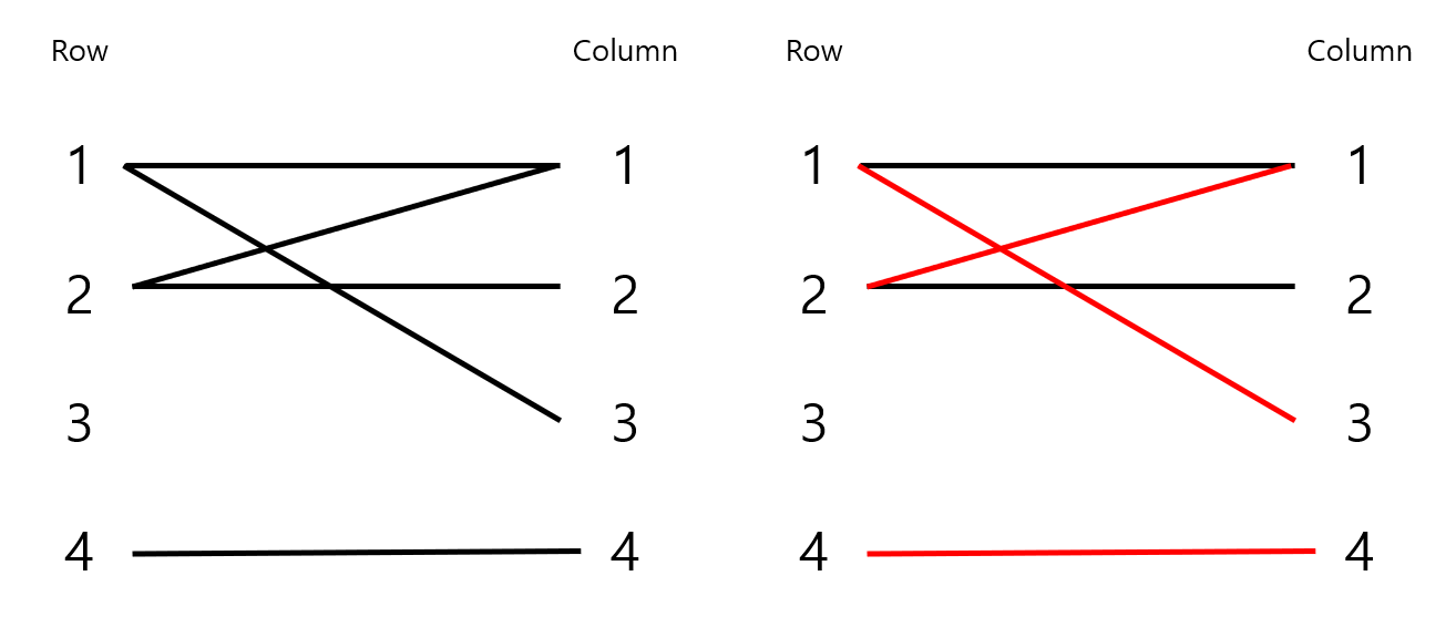 4번 열 노드가 아무런 매칭이 되어있지 않기 때문에 4번 행 노드와 4번 열 노드가 매칭 됩니다.